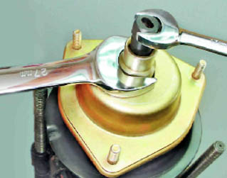 6. Удерживая ключом на 17 мм шток амортизатора от проворачивания, ключом на 27 мм отворачиваем его гайку.