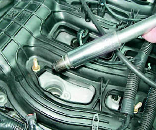Свечи зажигания заменаЗамечание: Работа показана на автомобиле с двигателем 21124 (1,6i). Особенности замены свечей на автомобиле с двигателем 2112 (1,5i) указаны в тексте. Свечи зажигания заменяем по рекомендации завода-изготовителя через каждые 30 000 км пробега, или при выходе их из строя, если двигатель стал работать неустойчиво на холостом ходу. Для выполнения работы потребуется: специальный торцовый ключ для свечей зажигания на 16 мм с удлинителем. В головке ключа должна быть установлена резиновая муфта, которая удерживает свечу. Снятие 1. На автомобиле с двигателем 21124 (1,6i) снимаем катушку зажигания первого цилиндра (см. 8.4.4, п. 1, 2, 8 и 9). На автомобиле с двигателем 2112 (1,5i) снимаем высоковольтные провода со свечей (см. выше 8.4.5, п. 1-3). 2. Торцовым ключом для свечей зажигания на 16 мм отворачиваем свечу, и извлекаем ее из гнезда. 3. Вынимаем свечу из головки ключа.