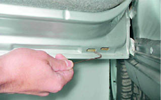 Замечание: Для удаления влаги из внутренних полостей в нижней части передних дверей выполнено по восемь дренажных отверстий в задних дверях - по шесть. В накладках порога выполнено по пять дренажных отверстий, а в порогах по четыре. В зависимости от года выпуска автомобиля, количество дренажных отверстий может быть другим. 4. Проволокой прочищаем дренажные отверстия в дверях,...