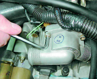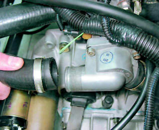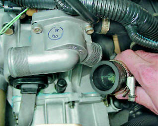 3. Ослабив затяжку хомутов, отсоединяем от крышки корпуса термостата шланг радиатора.