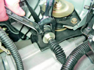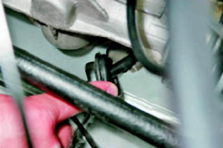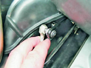 7. Снимаем расширительный бачок системы охлаждения двигателя, не отсоединяя шлангов (см. 13.8.1, п. 2-7). 8. Снимаем левую часть теплоизоляционной обивки моторного отсека (см. 13.8.1). 9. Ключом со съемным крестовым наконечником или короткой крестовой отверткой отворачиваем левый саморез крепления резинового чехла.