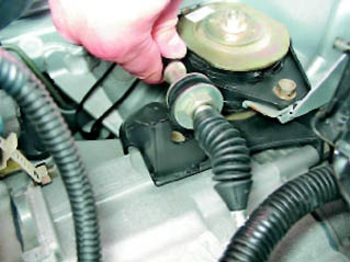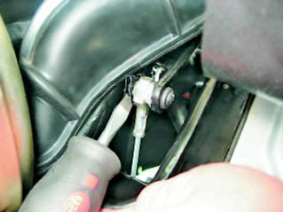 14. Выводим трос привода через отверстие перегородки моторного отсека в салон и снимаем его.