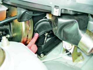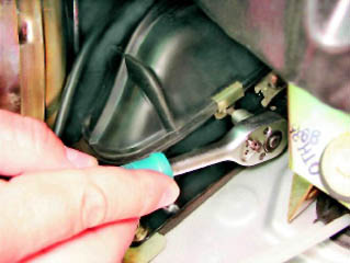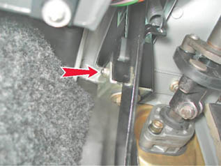 13. В салоне под панелью приборов ключом на 8 мм отворачиваем гайку крепления кронштейна оболочки троса.
