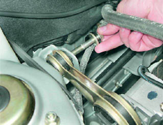 2. Двумя ключами на 15 мм отворачиваем гайку болта крепления штанги к двигателю.