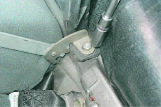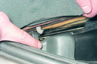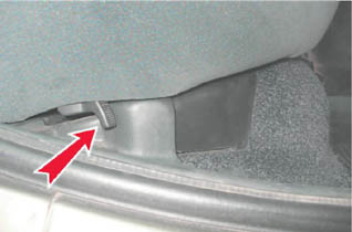 Заднее сиденье на автомобиле с кузовом седан1. Подготавливаем автомобиль к выполнению работы (см. 5, п. 2). 2. Открыв заднюю дверь автомобиля, пальцем отводим ручку правого фиксатора подушки заднего сиденья назад.