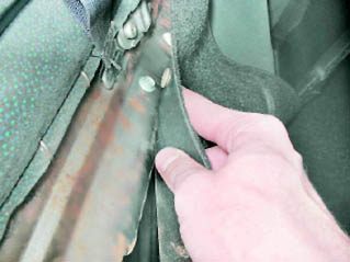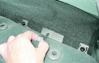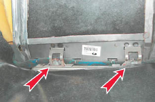 6. Потянув за петлю, освобождаем верхнюю часть секции спинки и отводим ее вперед, насколько позволяет обивка багажника.