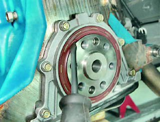 Наносим чистое моторное масло на рабочую поверхность нового сальника и запрессовываем его до упора молотком с пластмассовым бойком.