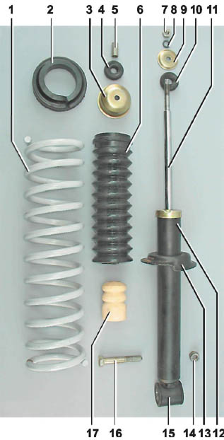 Пружина и детали амортизатора задней подвески: 1 - пружина; 2 резиновая прокладка; 3 - крышка кожуха; 4, 10 - подушки штока амортизатора; 5 - распорная втулка; 6 - кожух амортизатора; 7 - гайка штока; 8 пружинная шайба; 9 - опорная шайба; 11 - шток амортизатора; 12 - корпус амортизатора; 13 - нижняя опорная чашка пружины; 14 - гайка болта нижнего крепления амортизатора; 15 - проушина; 16 - болт нижнего крепления амортизатора; 17 - буфер хода сжатия |
