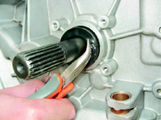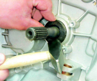 3. Аккуратно, чтобы не поцарапать первичный вал коробки, небольшим зубилом или кернером пробиваем сальник.