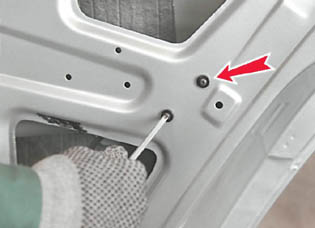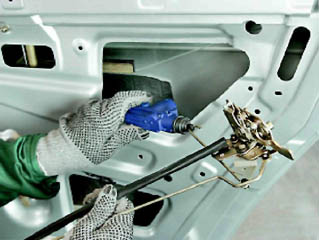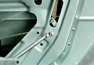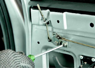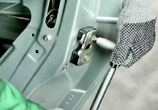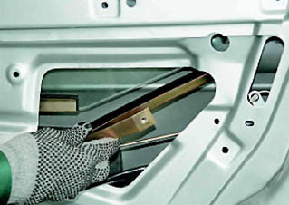 9. Шлицевой отверткой отсоединяем пластмассовый наконечник тяги наружной ручки двери от рычага замка (см. 14.3.2, п.3). 10. Торцовым ключом на 8 мм отворачиваем болт крепления задней направляющей стекла.