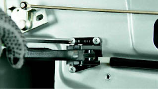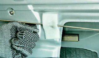 6. Отсоединяем от корпуса двери пластиковый хомут с противошумной поролоновой прокладкой, удерживающий горизонтальную тягу блокировки замка.