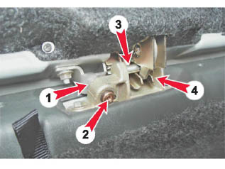 Привод замка двери: 1 - поперечная тяга; 2 - рычаг привода замка; 3 - продольная тяга; 4 - запорный механизм замка; 5 - направляющий шип; 6 тяга мотор-редуктора; 7 - мотор-редуктор; 8 - выключатель замка (личинка); 9 - колодка проводов мотор-редуктораЗамечание: Перед установкой нижней обивки двери следует проверить работу замка, надежность запирания двери и при необходимости отрегулировать замок. Регулировка Если дверь багажного отделения плохо фиксируется в закрытом положении (самопроизвольно открывается при движении автомобиля по неровной дороге или приходится сильно хлопать дверью, чтобы закрыть), необходимо отрегулировать замок двери. Также, регулировка может потребоваться после замены замка и его элементов, изменения положения двери в проеме и выполнения других ремонтных работ. Работу замка удобно проверить из салона, сложив заднее сиденье. Перекладина фиксатора (3) должна заходить в паз замка (4), не задевая кромок паза, а направляющий шип (1) должен поджать подпружиненное гнездо (2).
