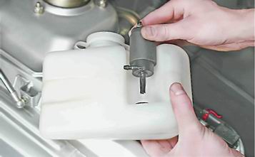 6. Сняв пробку, сливаем из бачка остатки омывающей жидкости в канистру. 7. При необходимости поддев отверткой, извлекаем электронасос из бачка.