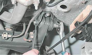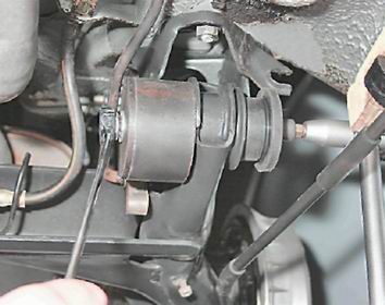 Балка задней подвески - замена сайлент-блокаДля замены сайлент-блока снятие балки с автомобиля не требуется. Сайлент-блоки меняем по очереди: сначала у одного, затем у другого рычага балки. Для выполнения работы потребуются: - подставка под автомобиль; - универсальный чашечный съемник. Снятие 1. Подготавливаем автомобиль к выполнению работ (см. "Подготовка автомобиля к техническому обслуживанию и ремонту"). 2. Снимаем заднее левое колесо и устанавливаем автомобиль на надежную подставку (см. "Подготовка автомобиля к техническому обслуживанию и ремонту"). 3. Отсоединяем упругий рычаг регулятора давления от серьги (см. "Регулятор давления жидкости в задних тормозных механизмах - снятие и установка"). 4. Освобождаем левый трос стояночного тормоза из двух кронштейнов крепления троса к левому рычагу задней подвески (см. "Тросы стояночного тормоза - снятие и установка"). 5. Торцовым ключом на 19 мм отворачиваем гайку болта крепления рычага к кронштейну кузова, удерживая болт накидным ключом на 19 мм.