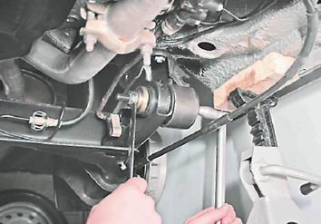 6. Вынимаем болт. Оттягиваем рычаг вниз (не натягивая тормозной шланг) и устанавливаем чашку съемника с наружной стороны, а специальную шайбу с внутренней стороны рычага. 7. Вращая гайку болта съемника, выпрессовываем сайлент-блок в чашку.