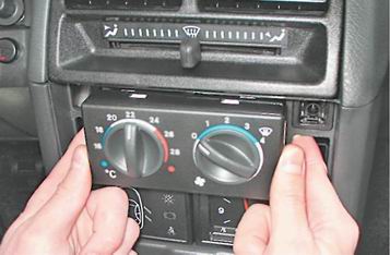 4. Через открывшиеся проемы сжимаем пружинные фиксаторы, расположенные с боков блока управления, и извлекаем блок из панели приборов.