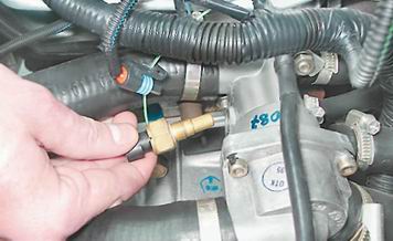 Неисправный датчик заменяем. Установка 1. Устанавливаем датчик в обратной последовательности. 2. Заполняем систему охлаждения двигателя жидкостью. 3. Запускаем двигатель и убеждаемся в отсутствии утечек охлаждающей жидкости из-под датчика. При необходимости сильнее заворачиваем датчик в корпус термостата. Рекомендация. Если таким способом устранить течь не удалось, следует переустановить датчик, нанеся на его резьбовую часть термостойкий герметик или заменить медную шайбу. |