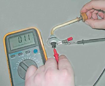 1. Подсоединяем мультиметр (в режиме омметра) к корпусу и выводу датчика.