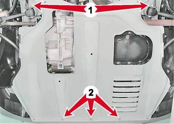 3. Устанавливаем защиту с задней части, надев ее проушинами на болты поперечных рычагов. Приподнимаем переднюю часть защиты, заведя ее в зацепление со шпильками крепления брызговика двигателя. Наживляем и заворачиваем гайки переднего крепления защиты (2). 4. Заворачиваем и затягиваем гайки болтов крепления поперечных рычагов. |