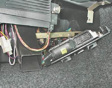 4. Сместив вперед, выводим пластмассовый кронштейн ЭБУ из зацепления со шпильками кронштейна электронных блоков и вынимаем ЭБУ из-под консоли.