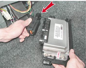 5. Освободив фиксатор колодки жгута проводов, отсоединяем колодку от ЭБУ.