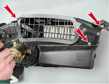 Электровентилятор отопителя - заменаСнятие 1. Снимаем отопитель (см. "Отопитель салона - снятие и установка"). 2. Крестовой отверткой отворачиваем четыре самореза, крепящих решетку воздушного фильтра системы вентиляции салона, и снимаем решетку.