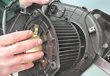 4. Вынимаем электровентилятор из корпуса отопителя. Предупреждение! Ротор электродвигателя вентилятора и крыльчатка вентилятора балансируются при изготовлении в сборе, поэтому не рекомендуется снимать крыльчатку с вала.