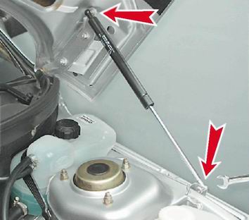 2. Открыв капот, рожковым ключом на 13 мм отворачиваем шаровые пальцы нижнего и верхнего крепления газового упора (не потеряйте стопорные шайбы, надетые на пальцы).