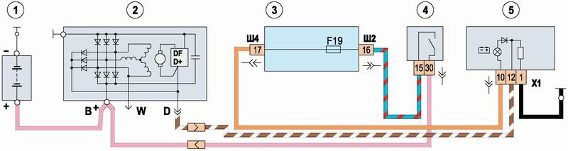Схема электрических соединений генератора: 1 - аккумуляторная батарея; 2 - генератор; 3 - монтажный блок; 4 - выключатель (замок) зажигания; 5 - контрольная лампа заряда аккумуляторной батареи в щитке приборов |