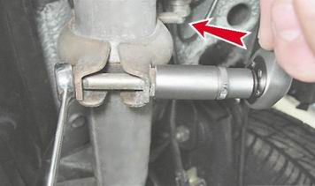 2. Торцовым ключом с глубокой головкой на 13 мм отворачиваем гайки двух стяжных болтов хомута основного глушителя, удерживая болты накидным ключом того же размера.