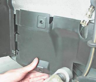 Работа показана на левом щитке. Правый щиток снимается и устанавливается аналогично. Для выполнения работы потребуются домкрат и подставка.