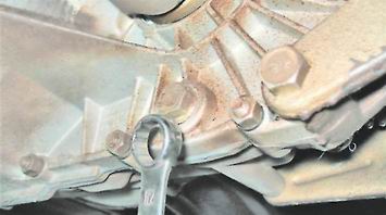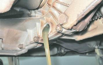 Коробка передач - замена маслаМасло в коробке передач заменяем через 75000 км пробега либо через пять лет эксплуатации, в зависимости от того что наступит раньше. Совет. Масло лучше менять сразу после поездки, пока горячее. Так оно быстрее и полнее сливается вместе со взвешенными частицами. Предупреждение! Температура разогретого масла может достигать 90°С. Будьте осторожны. Для выполнения работы потребуются: - смотровая яма или эстакада; - широкая емкость объемом не менее 4 литров; - воронка или специальный шприц. Последовательность выполнения 1. Подготавливаем автомобиль к выполнению работы (см. "Подготовка автомобиля к техническому обслуживанию и ремонту"). Замечание. Доступ к пробке сливного отверстия возможен через отверстие в брызговике двигателя. Следует учесть, что в начальный момент слива масла струя попадет на верхнюю поверхность брызговика двигателя и растечется по ней. Чтобы избежать разлива масла, можно загнуть кромку брызговика вверх (напротив сливного отверстия) или снять брызговик с автомобиля. 2. Устанавливаем под сливное отверстие картера коробки передач емкость. 3. Накидным ключом на 17 мм отворачиваем пробку сливного отверстия.