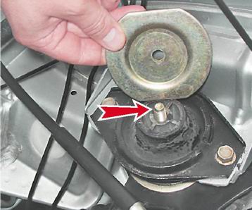 6. Немного сдвинув подушку к двигателю, снимаем ее с кронштейна.