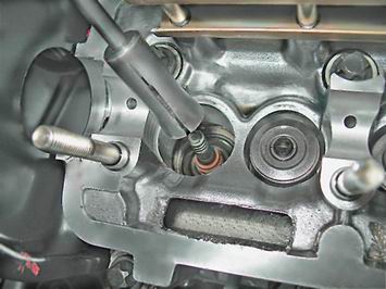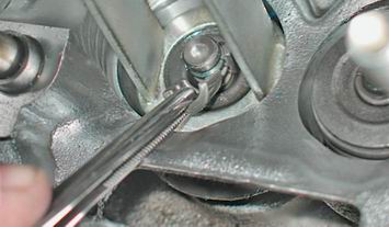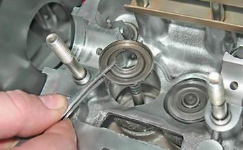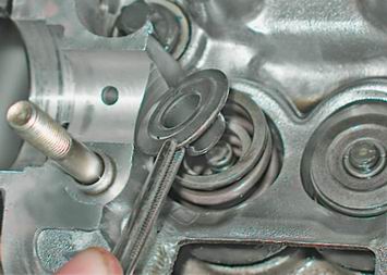 6. Устанавливаем приспособление для рассухаривания клапанов на шпильки головки блока цилиндров. 7. Чашку приспособления упираем в тарелку пружины. Предупреждение! При выполнении следующей операции не поцарапайте рассухаривателем стенки посадочного отверстия толкателя в головке блока цилиндров. 8. Надавив на ручку рассухаривателя, сжимаем пружины клапана. 9. Удерживая пружины сжатыми, пинцетом извлекаем два сухаря.