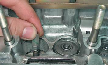 3. Чтобы установить толкатели на прежние места, маркируем их или раскладываем в порядке расположения в двигателе. 4. Выворачиваем свечу цилиндра, у клапана которого заменяем маслосъемный колпачок (см. "Свечи зажигания двигателей 2111 и 21114 (8V) - снятие и установка"). 5. Вставляем оловянный пруток в свечное отверстие, так чтобы его конец оказался под тарелкой соответствующего клапана.