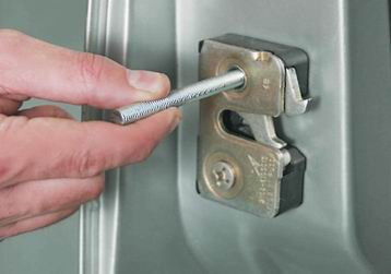 Наружная часть замка передней двери - заменаДля выполнения работы потребуются шпилька с резьбой М8 длиной приблизительно 100 мм и вороток из набора торцовых ключей с большим крестовым наконечником.