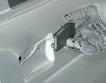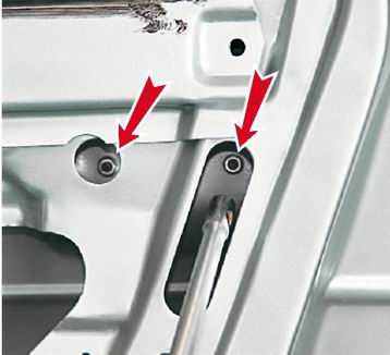 4. Торцовым ключом на 10 мм с удлинителем через отверстия во внутренней панели двери отворачиваем две гайки крепления наружной ручки двери.
