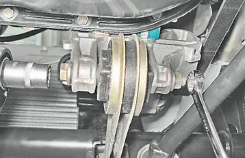4. Двумя ключами на 15 мм отворачиваем гайку болта крепления штанги к двигателю.