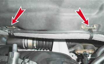 Совет. На автомобилях с двигателями 2112, 21114 и 21124 для удобства дальнейшей работы снимите декоративную накладку двигателя (см. "Декоративная накладка двигателя - снятие и установка"). 4. Поддев отверткой, отсоединяем два хомута крепления шланга вакуумного усилителя тормозов от правой обивки моторного отсека.