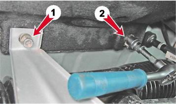 5. Торцовым ключом на 10 мм с трещоткой отворачиваем гайку нижнего крепления правой части обивки моторного отсека (1) и гайку верхнего крепления защитного экрана (2).