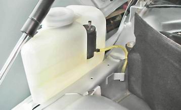 6. Отсоединяем наконечники проводов от выводов насоса омывателя заднего стекла и снимаем ремень крепления бачка стеклоомывателя (см. "Бачок стеклоомывателя заднего стекла - снятие и установка"). Извлекаем бачок стеклоомывателя и, не отсоединяя от него шланг, устанавливаем бачок на крыло.