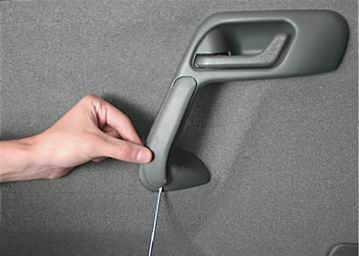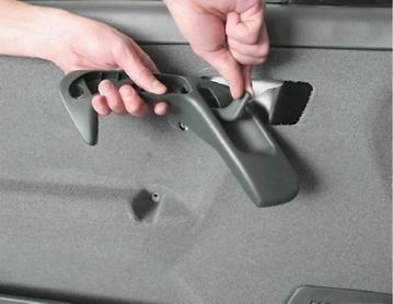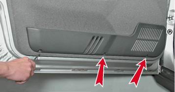 Замечание. Следует стараться извлечь держатели из отверстий двери. Чтобы не повредить обивку, располагайте лезвие отвертки как можно ближе к держателям. 10. Снимаем обивку.