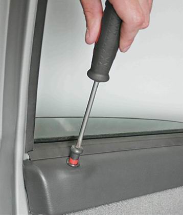 6. На двери, оборудованной стеклоподъемником с механическим приводом, снимаем ручку привода стеклоподъемника (см. "Обивка задней двери - снятие и установка"). 7. Крестовой отверткой отворачиваем три самореза крепления нижней пластмассовой накладки облицовки обивки.