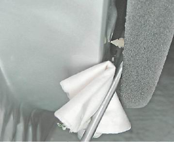 9. Шлицевой отверткой с широким лезвием (подложив под нее ткань, сложенную в несколько слоев) отжимаем обивку от двери, при этом извлекаем восемь держателей крепления обивки из отверстий двери.