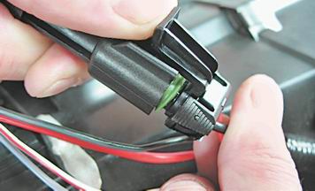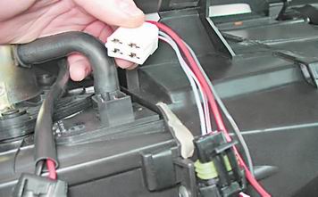 7. Отжав фиксатор, разъединяем колодки проводов электровентилятора отопителя.