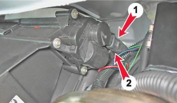 9. Отсоединяем колодку жгута проводов(2) от электропривода заслонки отопителя и колодку (1) от датчика положения заслонки.
