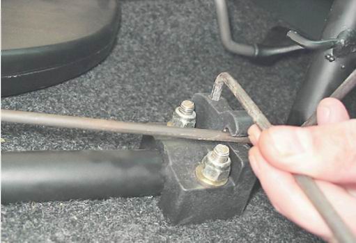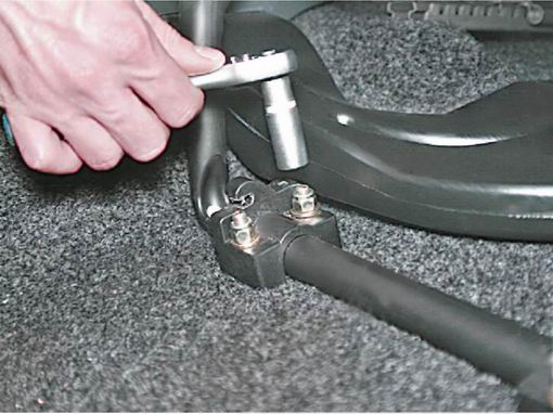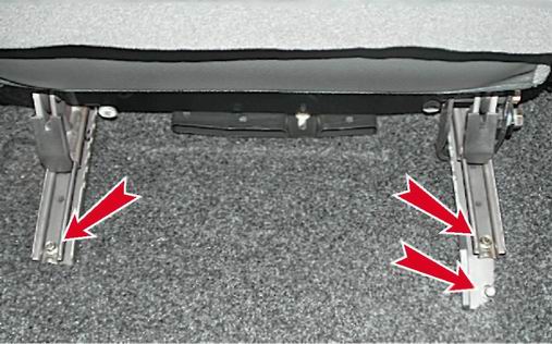 8. Сдвинув сиденье вперед, торцовым ключом на 8 мм отворачиваем три болта задних креплений салазок.