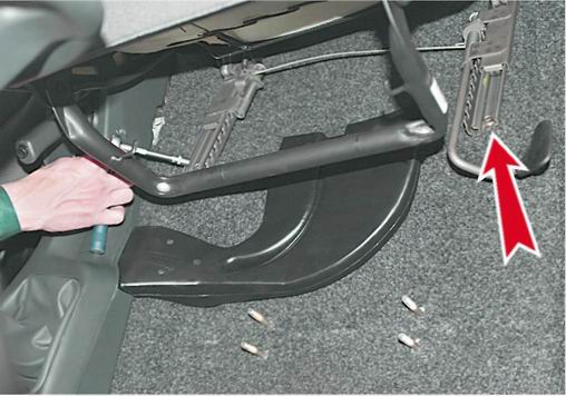Переднее сиденье - снятие и установкаЗамечание. Работа показана на переднем левом сиденье. Правое сиденье снимается и устанавливается аналогично. Снятие 1. Подготавливаем автомобиль к выполнению работы (см. "Подготовка автомобиля к техническому обслуживанию и ремонту"). 2. Сдвигаем сиденье вперед до упора. 3. Выводим концы торсионов из зацепления с передними стойками сиденья.