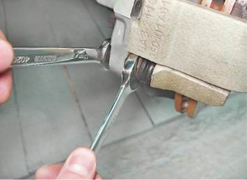 7. Вынимаем тормозной шланг из кронштейна стойки. 8. Удерживая от вращения направляющий палец рожковым ключом на 17 мм, отворачиваем его болт ключом на 13 мм.