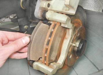 Передние тормозные колодки - заменаНиже описано, как заменяются тормозные колодки без датчиков износа. Для замены колодок с датчиками дополнительно отсоединяем наконечник провода датчика от колодки жгута проводов. Для выполнения работы потребуются: - надежная подставка под автомобиль; - струбцина; - небольшая металлическая щетка. Снятие 1. Подготавливаем автомобиль к проведению работы (см. "Подготовка автомобиля к техническому обслуживанию и ремонту"). 2. Снимаем передние колеса (см. "Колесо - замена"). 3. Очищаем от грязи бачок главного тормозного цилиндра. Снимаем крышку бачка. Если уровень жидкости в бачке главного тормозного цилиндра находится на отметке "MAX", резиновой грушей отбираем часть жидкости из бачка. 4. Очищаем тормозной механизм от грязи. 5. Утапливаем выдвинутый поршень в цилиндр при помощи струбцины.